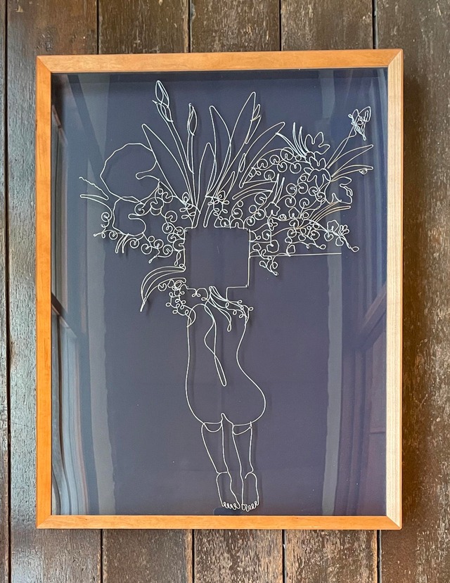一本のワイヤーを一筆書きのように描く繊細な作品です。額装されていますが、取り扱いには十分ご注意ください。万が一、ワイヤーが変形などした場合、お問い合わせいただけましたら、出来る限りのことはさせていただきます。尚、修復費・送料などはご購入者様のご負担となります。ご了承ください。